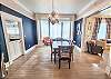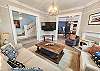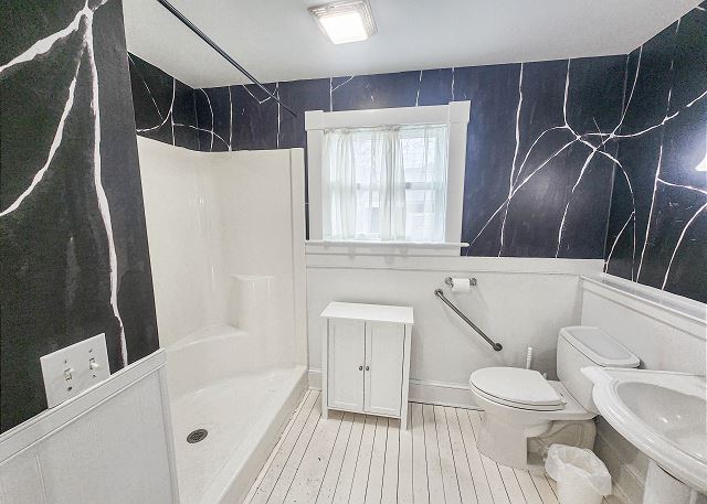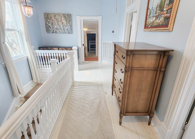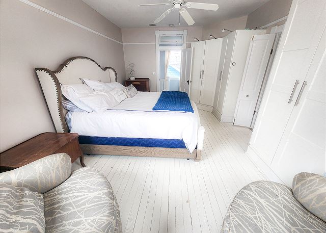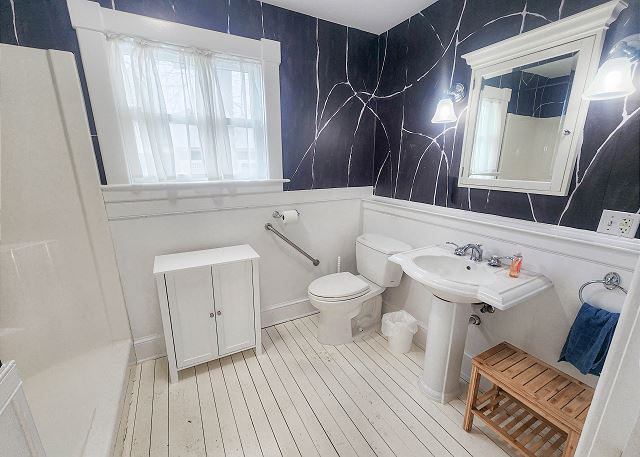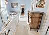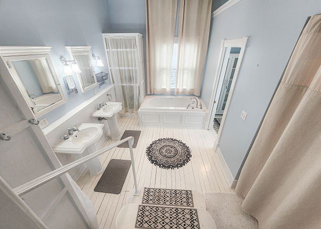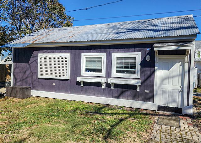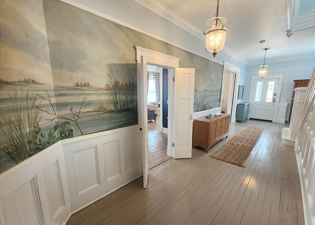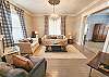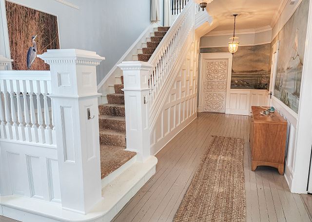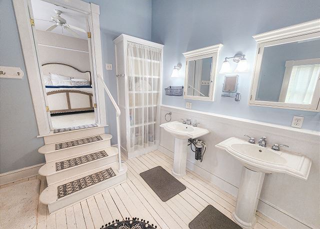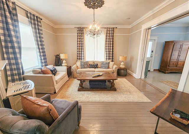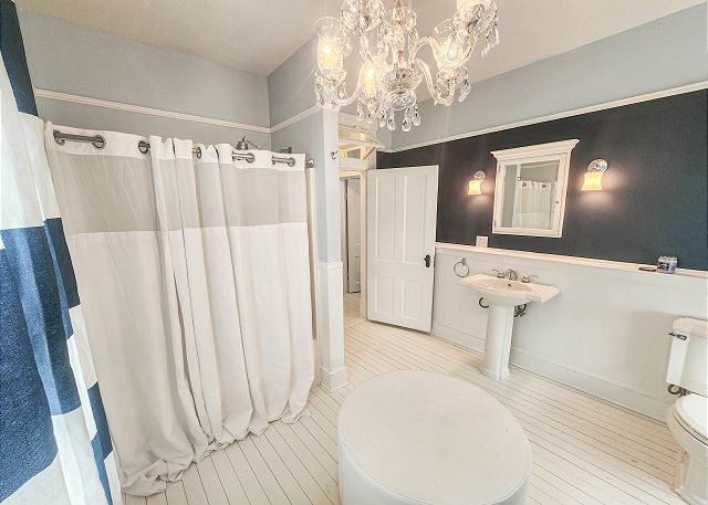 Upstairs, all three bedrooms provide a peaceful retreat. The primary suite offers a king bed and a spa-like bathroom featuring a soaking tub, separate shower, and double sinks. The second bedroom also features a king bed, while the third bedroom includes a charming set of twin bunk beds—ideal for guests or children. A full hallway bathroom with a tub/shower combination serves the additional bedrooms. Character abounds throughout the home with charming Dutch doors, stylish sliding barn doors, and elegant crystal chandeliers that add a touch of sparkle to every room. Every detail has been thoughtfully curated to combine comfort, charm, and coastal sophistication. Outdoor living is just as inviting. The welcoming front porch is furnished for comfortable sitting—perfect for morning coffee or evening conversations. In the back, you’ll find a porch and yard with additional seating and a grill, ideal for cookouts, relaxing under the stars, and making lasting vacation memories.